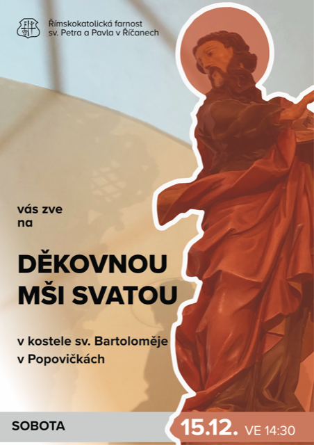 Římskokatolická farnost sv. Petra a Pavla v Říčanech ve spolupráci s OÚ Popovičky Vás srdečně zve na mši svatou při 3. adventní neděli, ku příležitosti poděkování za znovuotevření zrekonstruovaného kostela sv. Bartoloměje v Popovičkách. Zahájení slavnostní mše sv. bude v sobotu 15.12.2018 od 14.30 a hlavním hostem bude strahovský opat Michael Pojezdný, který přijal naše pozvání. Těšíme se na vás.